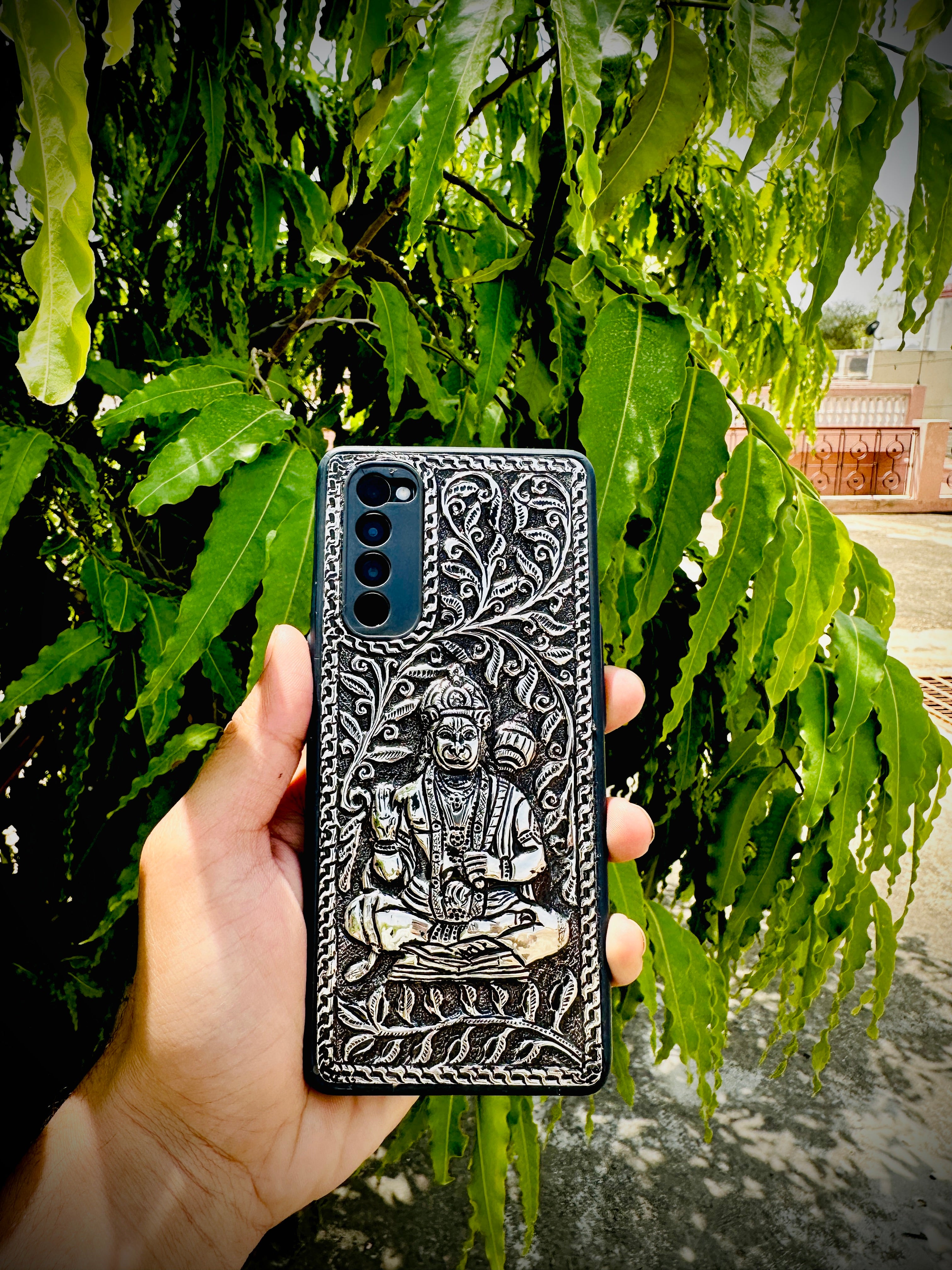 Protect your phone with the divine power of Hanuman. This stunning silver phone cover is a work of art, handcrafted with intricate details that capture the essence of the revered Hindu deity